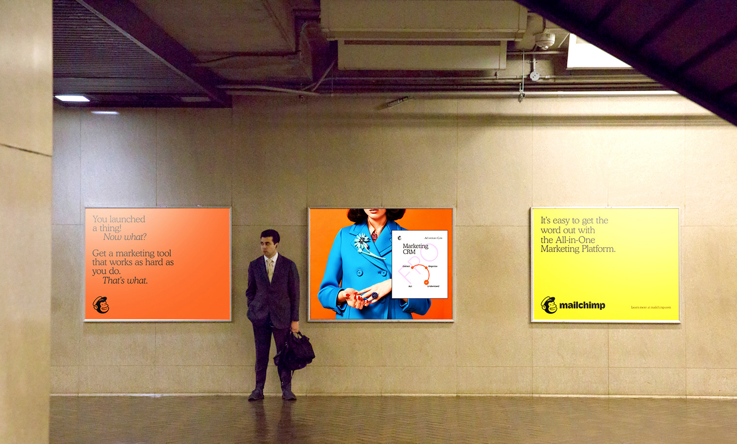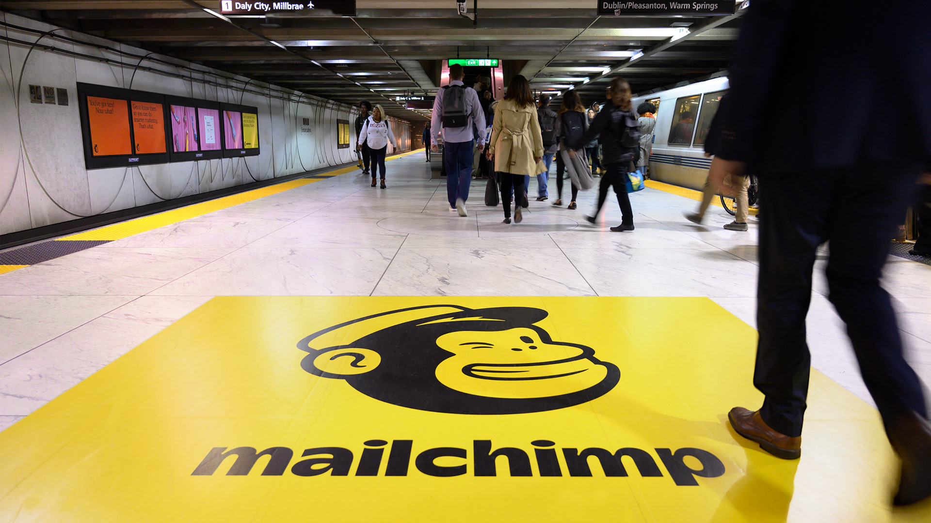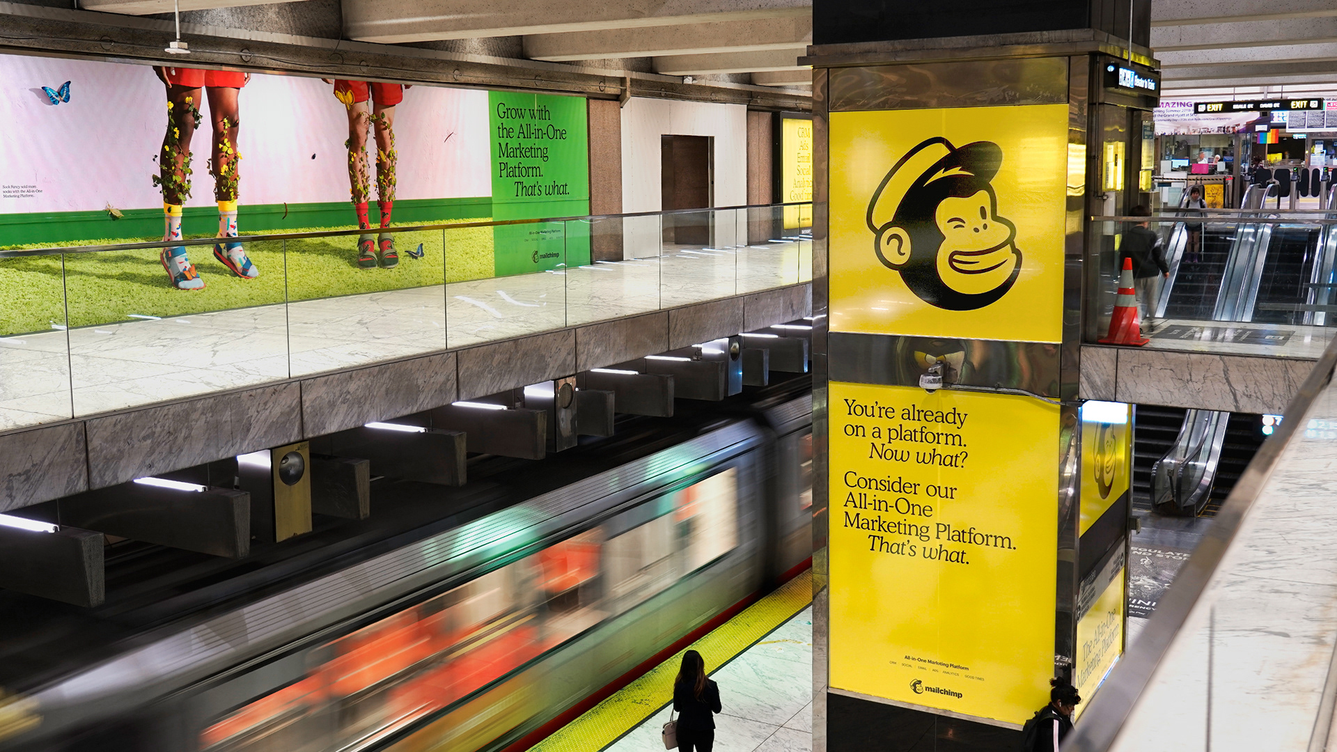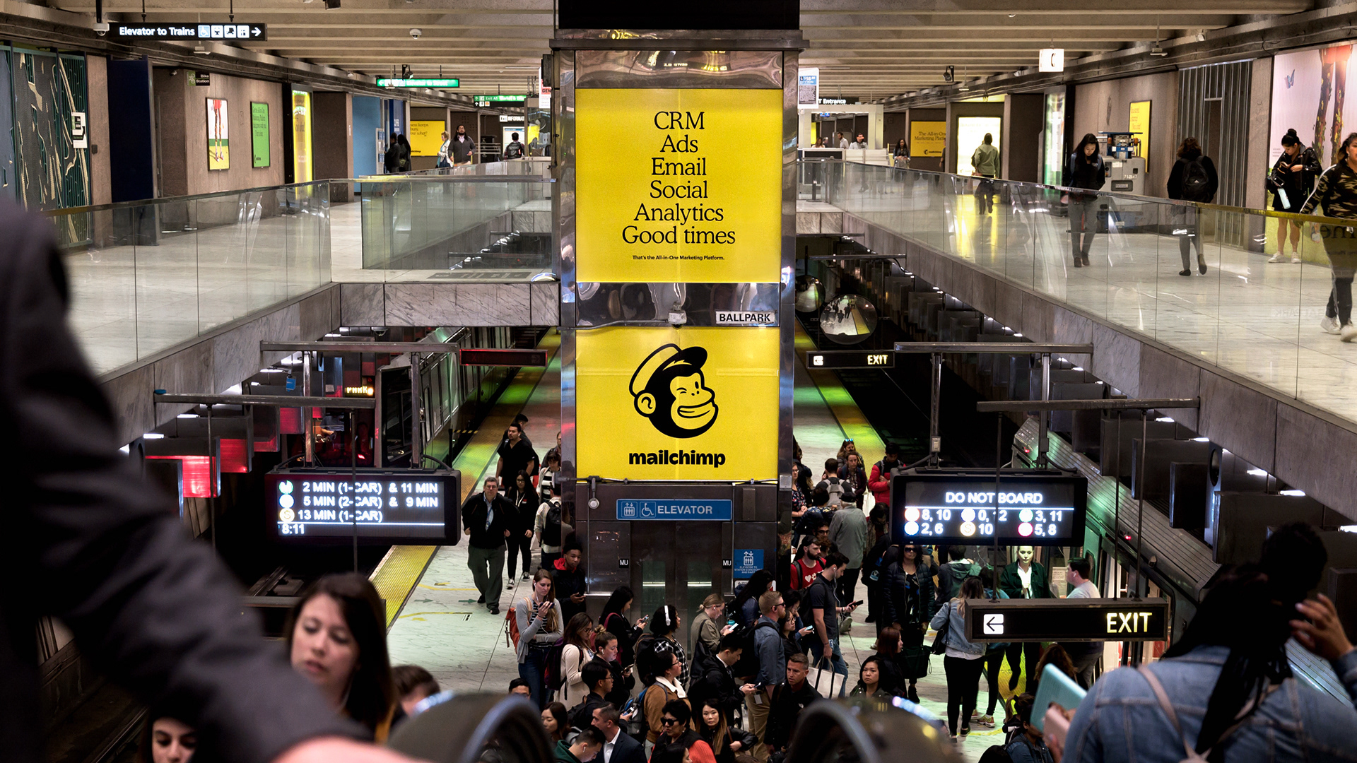 OOH marketing campaign that focused on MailChimp's All-in-One comprehensive marketing platform using 383 total units including station dominations in San Francisco and Atlanta, magazine ads, digital walls, kiosks, billboards, and a full subway wrap in New York City